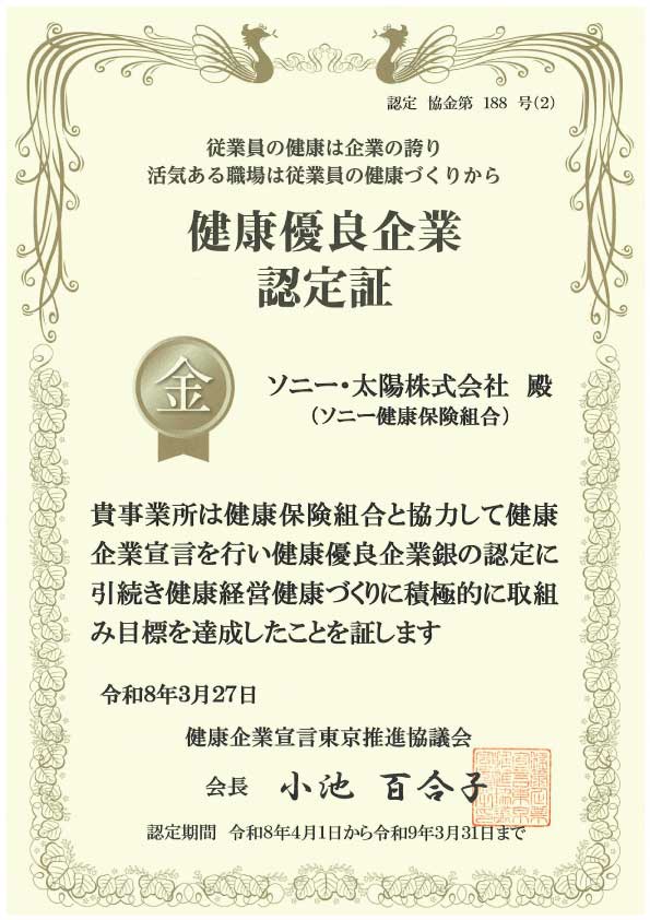 ソニー・太陽株式会社は、2026年3月27日付で、健康企業宣言東京推進協議会より「健康優良企業(金の認定)」を更新いたしました。当社は2023年度から継続して認定を受けており、今回の更新による認定期間は令和8年4月1日から令和9年3月31日までとなります。